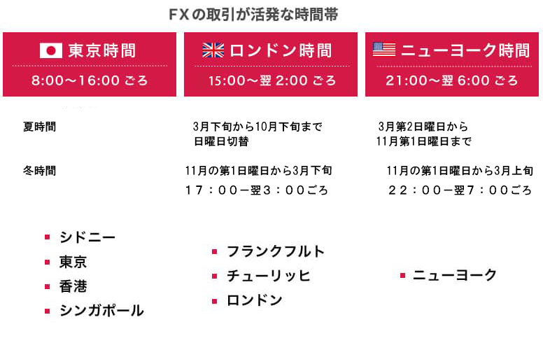 FX取引が活発な時間帯、各市場の時間帯